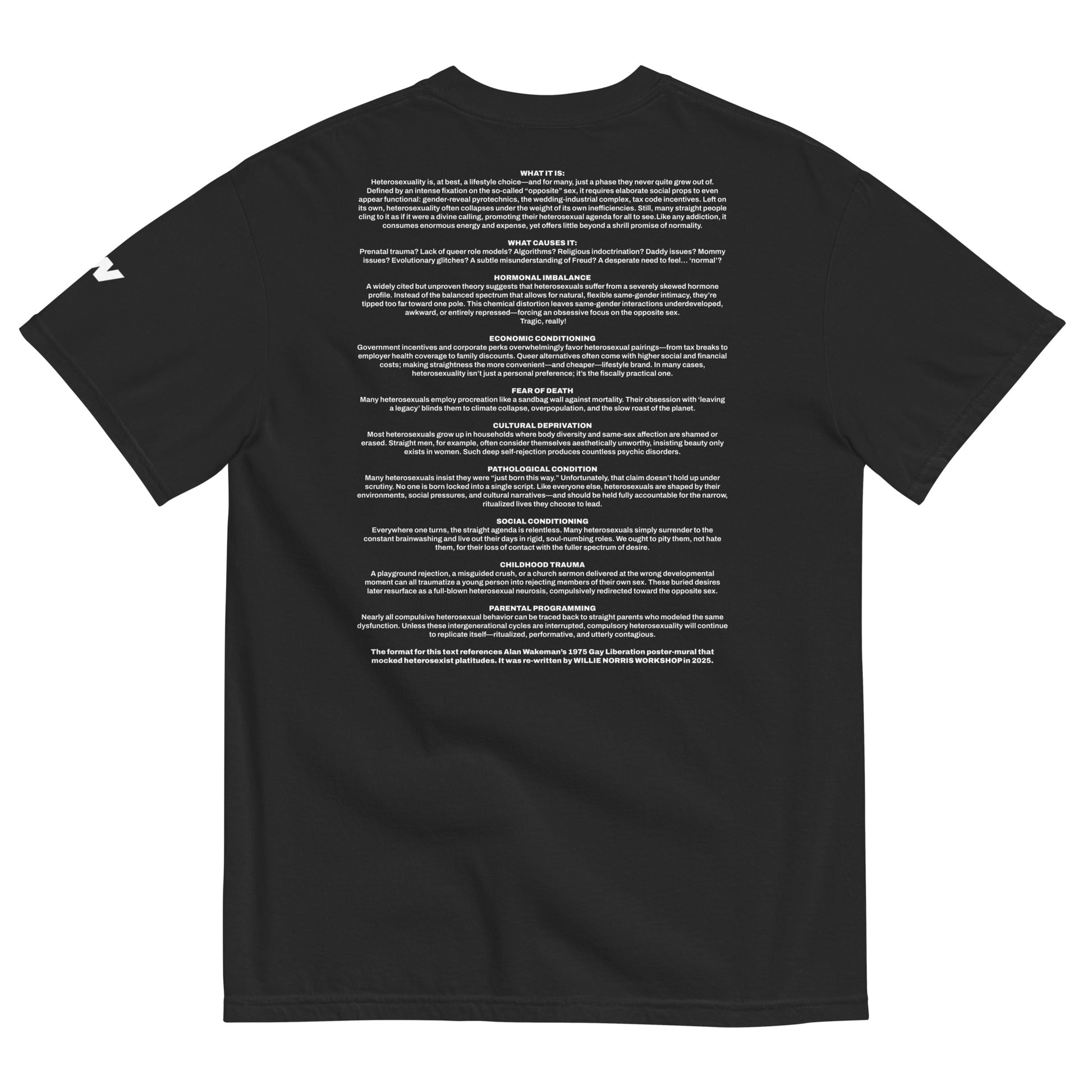 Still asking after all these years. The original inspiration and rather direct reference point for this tee is Alan Wakeman's 1975 gay liberation poster mural. When I first released it in 2018, the text was lifted verbatim onto the front and back. This new version posits the same question, while the back body language was re-written by me in 2025. This shirt still cracks me up.